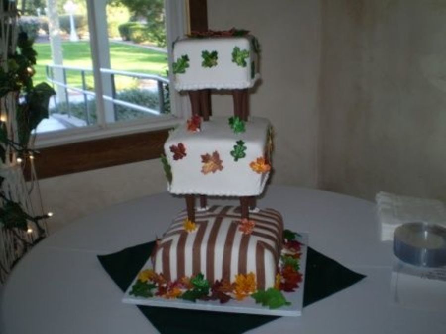 The couple designed this cake in July for a Nov. wedding. In Az it was 90 degrees. We can dream of a real fall. My sweet daughter did all the leaves.