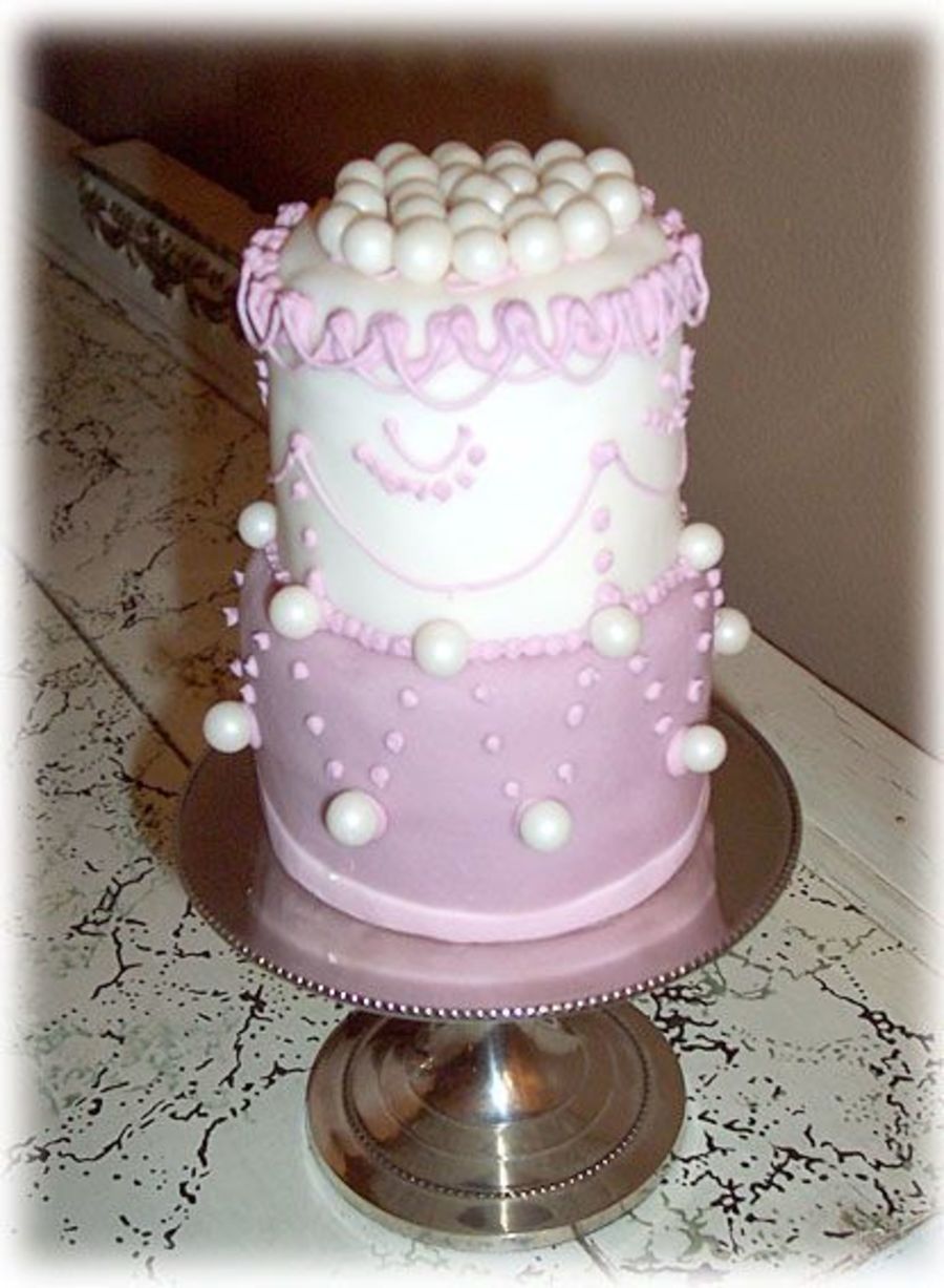 This is just a little mini cake I wanted to experiment with. Fondant with royal scrolls and edible pearls. The stand was found at Michaels, and I think it was supposed to be a candle stand, but loooks like a mini cake stand.
