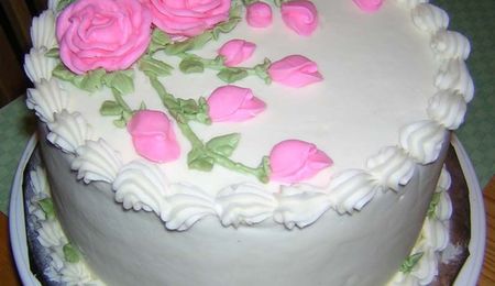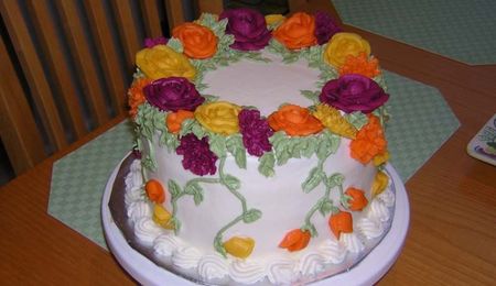 I made this for a potluck with friends...the cake design is from the Wilton Reference book. Inside is the freckled mocha cake with Bailey's mousse from the WBH cookbook. I think this was a one-time design...200 flowers takes forever! Thanks for looking.