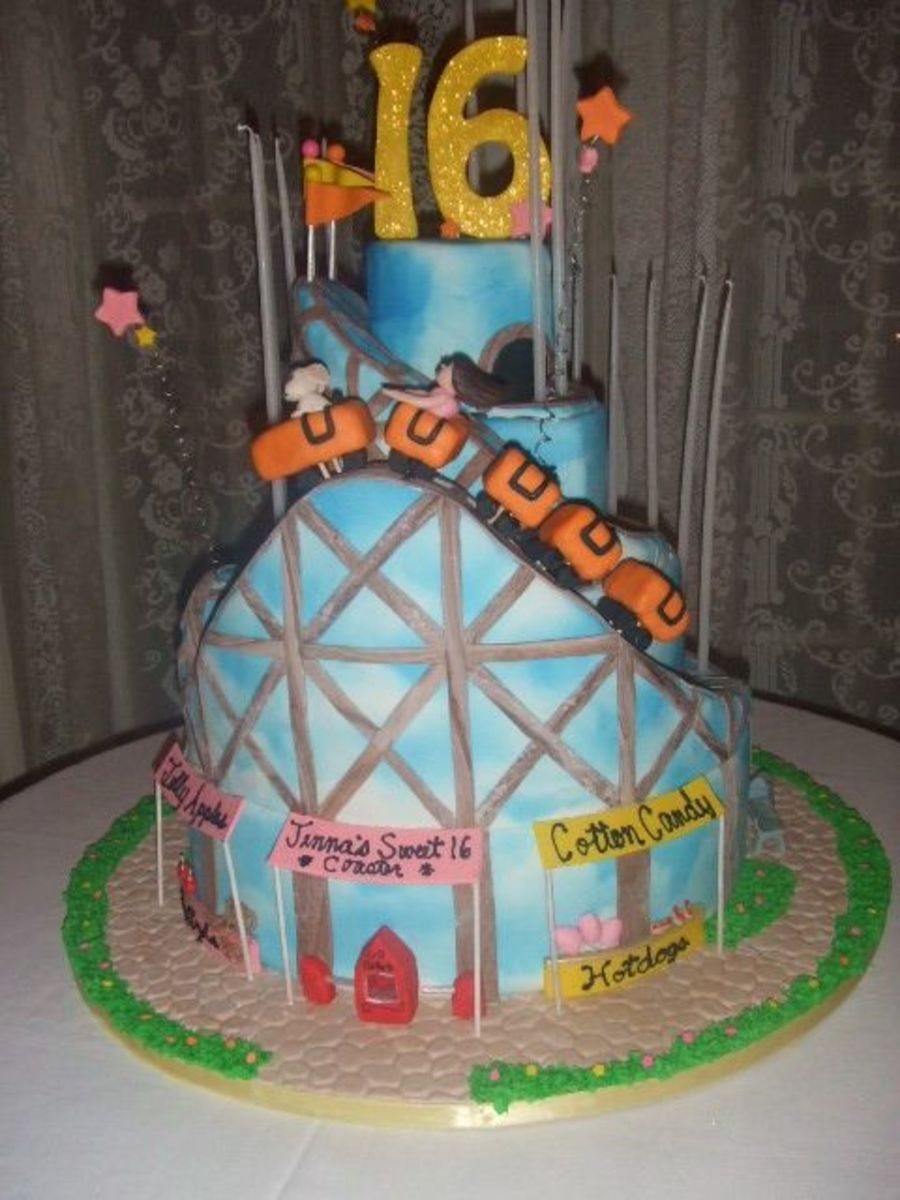 This is a four tier cake with a base on the bottom and top of each tier, The roller coaster is made of rice treats and covered in fondant then placed on each tier. it was alot of fun to make and everyone couldn't believe it was a real cake. Thanks!