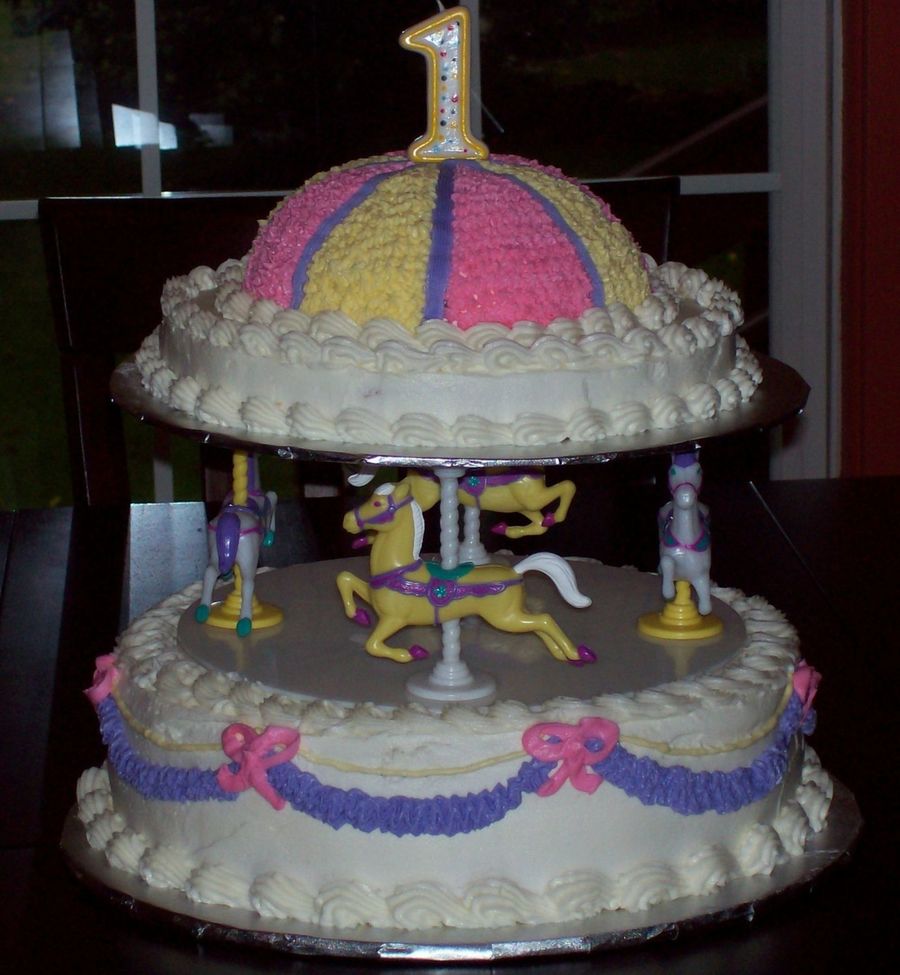 2-12" round white cake w/ strawberry glaze in the middle w/ buttercream frosting. Middle is Wilton's carousel. Top is 1-10" white cake w/ 1/2 round cake made with a stainless steel mixing bowl. This was my daughter's first birthday cake. Everyone loved it. The very top round cake comes off for her to mess up. Took 3 cake mixes and about 15 cups of icing.