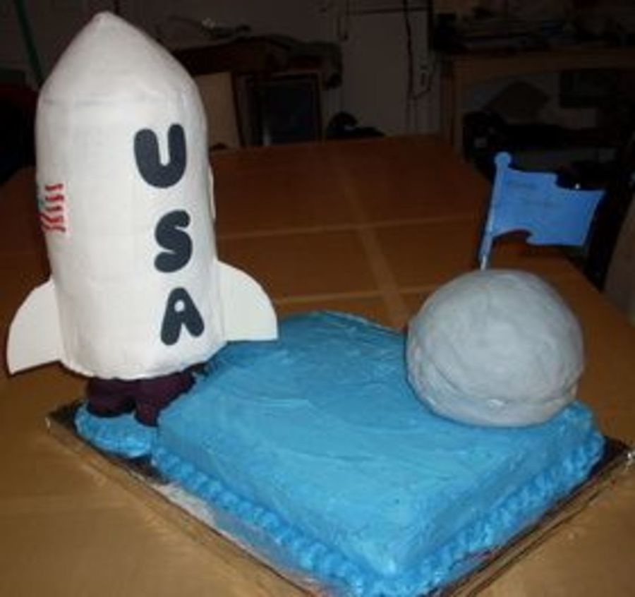 The rocket and the moon is yellow pound cake. Bottom base is chocolate. Buttercream on the rocket and sky. The moon is fondant. The Rocket stands over a foot tall.