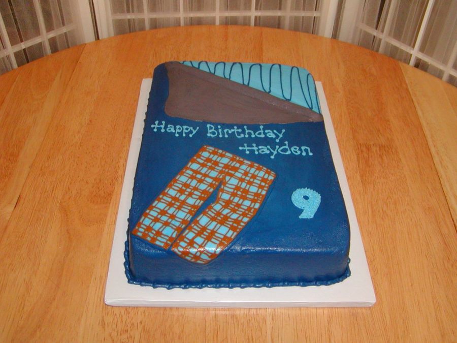 Cake was made to look like little boy's sleeping bag and pj's. 1/4 sheet vanilla, BC, with FBCT pj's. TFL