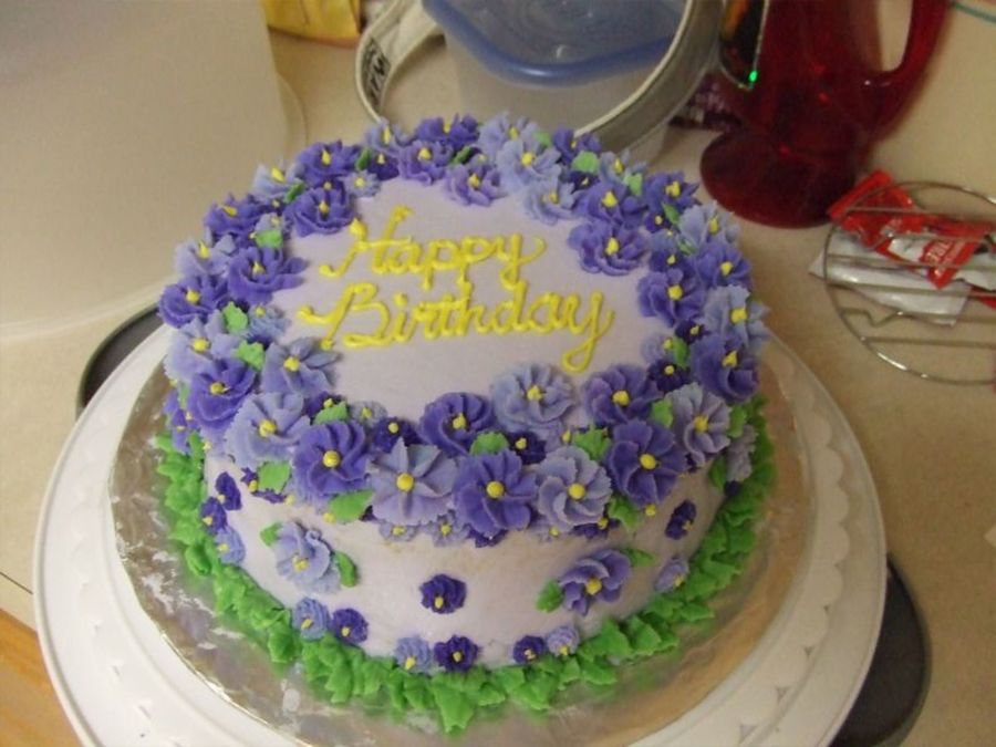 My future mother-in-law's birthday is less than a week apart from my FFIL's, and I felt so bad, because her cake came out so much nicer. She loves purple, and she adored this cake. Simple yellow cake (my favorite) covered in swirl flowers. This could've come out so much nicer if I'd done it after taking Course 2, since I actually learned more flowers. Oh, well. Next year.