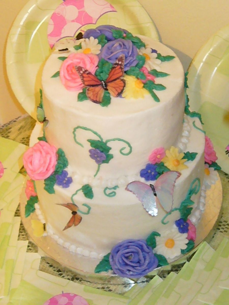 Each tier is one layer of strawberry cake and one layer of banana cake, with raspberry preserves in between. The icing is all buttercream, with buttercream flowers, and edible butterflies I made myself. It's hard to see in the picture, but I put pearl dust on the pearls trimming the tiers and on the wings of the butterflies and on the tips of the rose petals and centers of the daisies. This was for a baby shower and it's my 5th cake ever! I'm pretty proud of how it turned out.