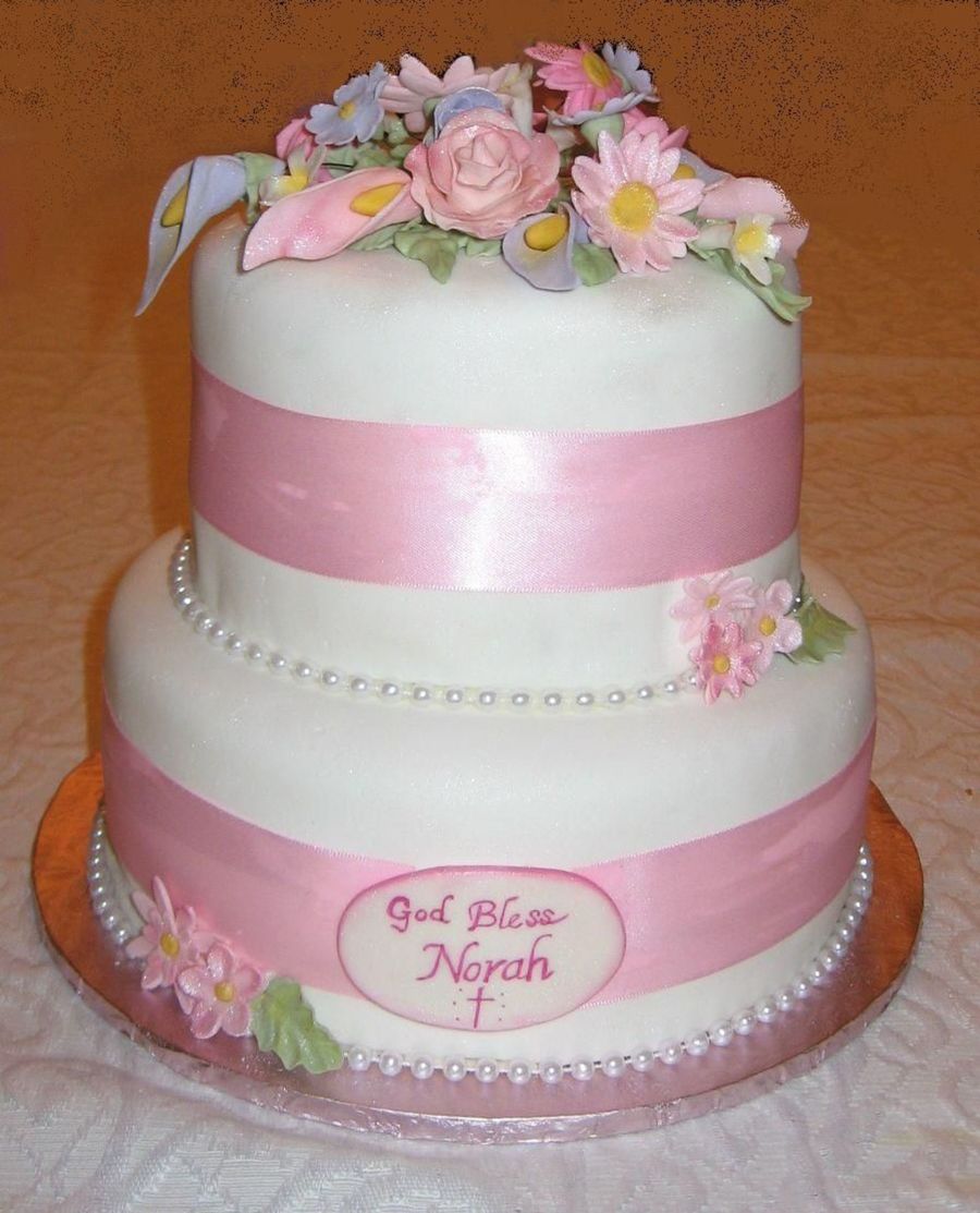 Covered in fondant with satin ribbon and gumpaste flowers.
