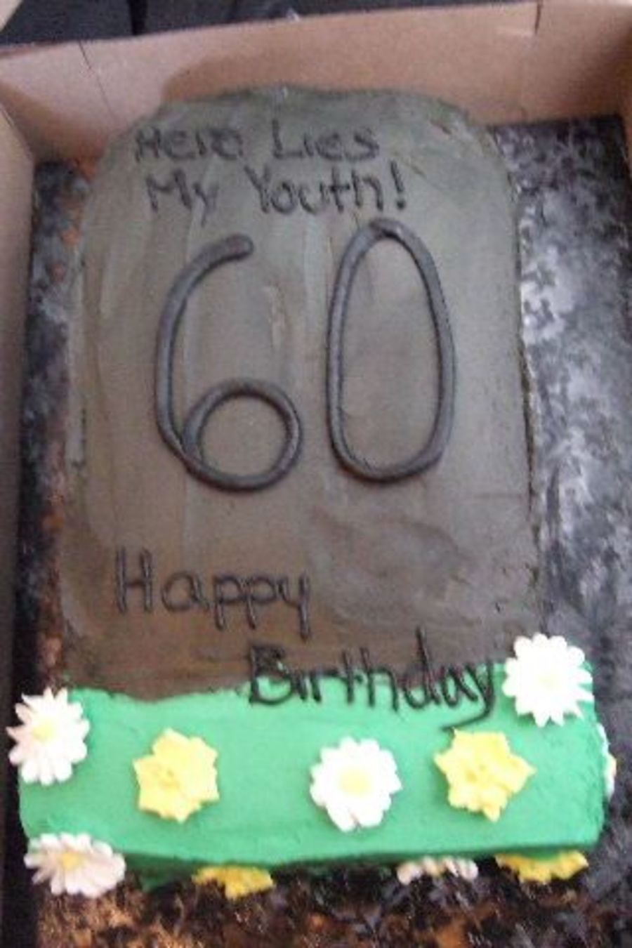 "Here lies my Youth" Tombstone cake