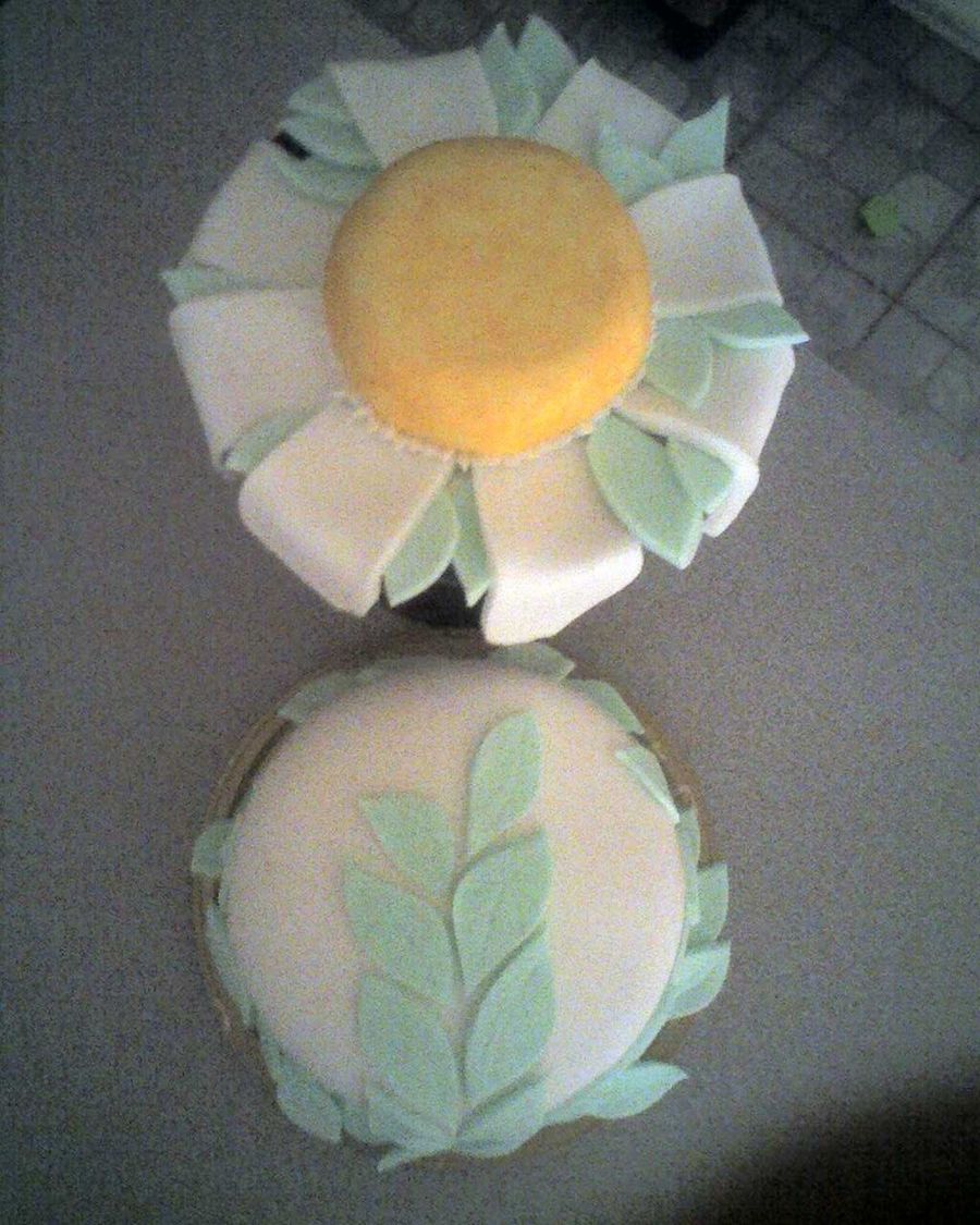 Red velvet cake w/ cream cheese filling. Fondant icing on the cake, the leaves and daisy petals. Large sugar cookie for the yellow portion of the flower.