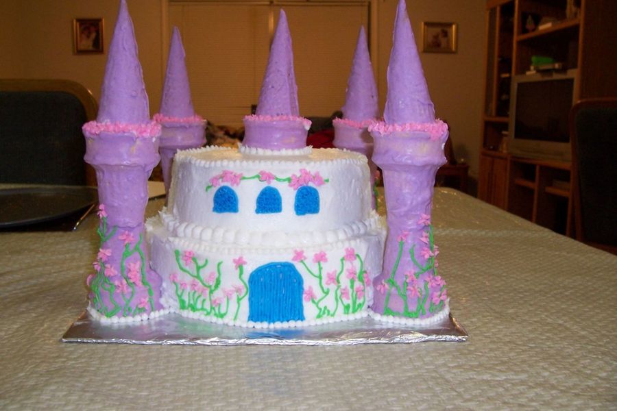 Choc & Vanilla swirl cake w/ buttercream icing. Towers are ice cream cones dipped in almond bark.