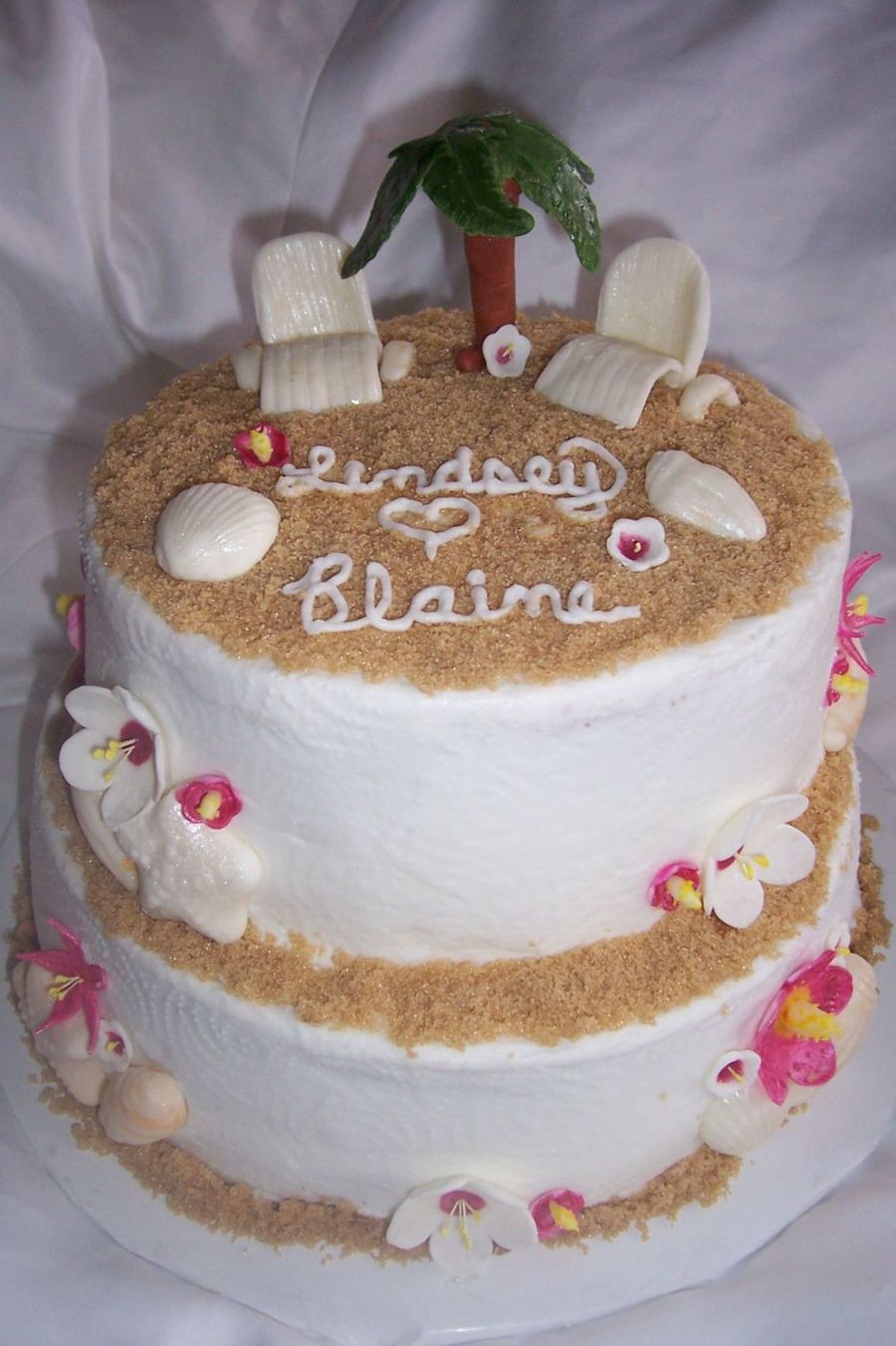 This couple are getting married on the beach in mexico next month. Cake Decorated with MMF flowers, chairs, palm tree and seashells. Iced in BC.