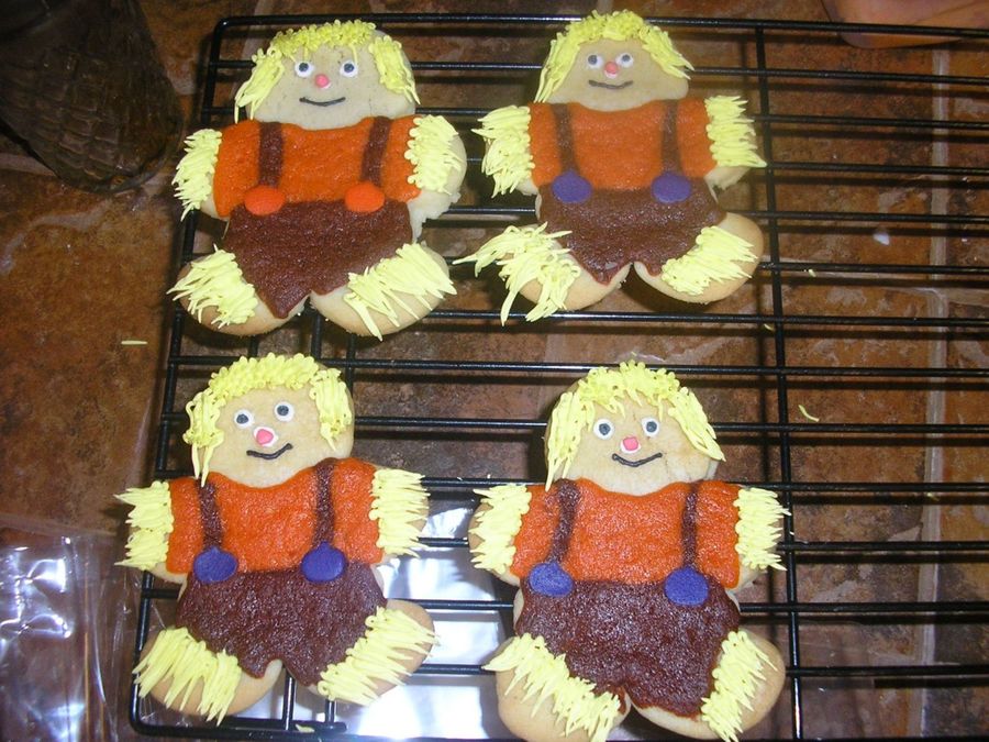 Esta galletas no tinen mucho icing ya que lo que hice fue pintar la masa de los colores de pantalo y la camisa, pero la paja de las manos y el pelo son royal icing. De esta forma la galleta no es tan dulce.