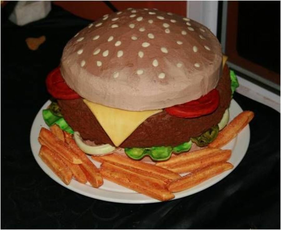 My fiance and I did this cake for my future father-in-laws 50th birthday. It was a 60's theme party and he loves all things Elvis, so we decided to do Elvis's favorite food. The entire cake was edible and all decorations, including the frys were made out of MMF. My fiance is an incredible artist and hand painted each piece with food coloring. The buns were made of white cake and the patty was made from chocolate fudge cake and covered in chocolate cookie crumbs to give the icing a real burger patty look.