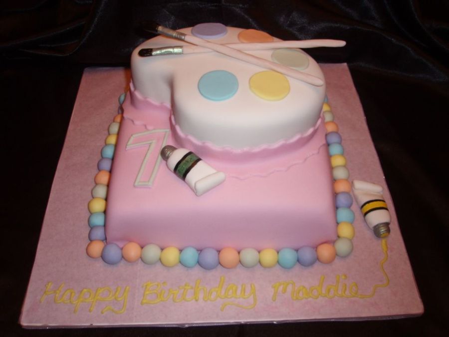 This is a birthday cake made for my daughter's 7th birthday party. We brought it to a location where the kids painted pottery for the party. The palette is a carved WASC cake covered with fondant (starting with the oval cake pan). The base is just a square chocolate cake also covered in fondant. The paint tubes are fondant and the paint bruses are gumpaste.