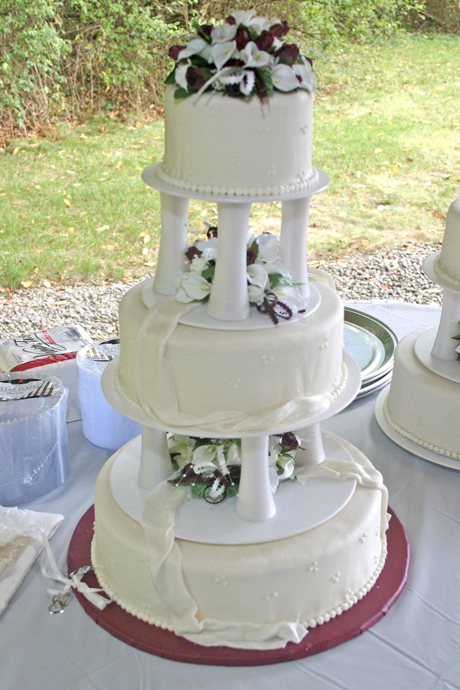 This is one of the two cakes I made for my sister's wedding. Please keep in mind that this was my first wedding cake ever. buttercream covered with mmf with mmf swags and silk flowers.