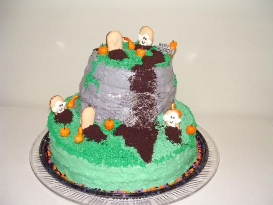 A 5 tier cake with milano cookies for tombstones and oreo cookies for the dirt. The ghost and pumpkins were store bought and a Happy Halloween sign to top it off.