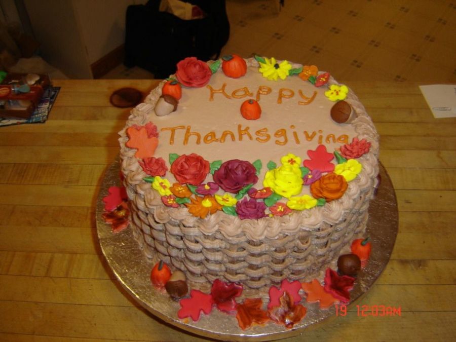 10" Vanilla Carmel cake, with Chocolate BC icing. Royal icing flowers, fondant pumpkins, acorns, and leaves. Basketweave.