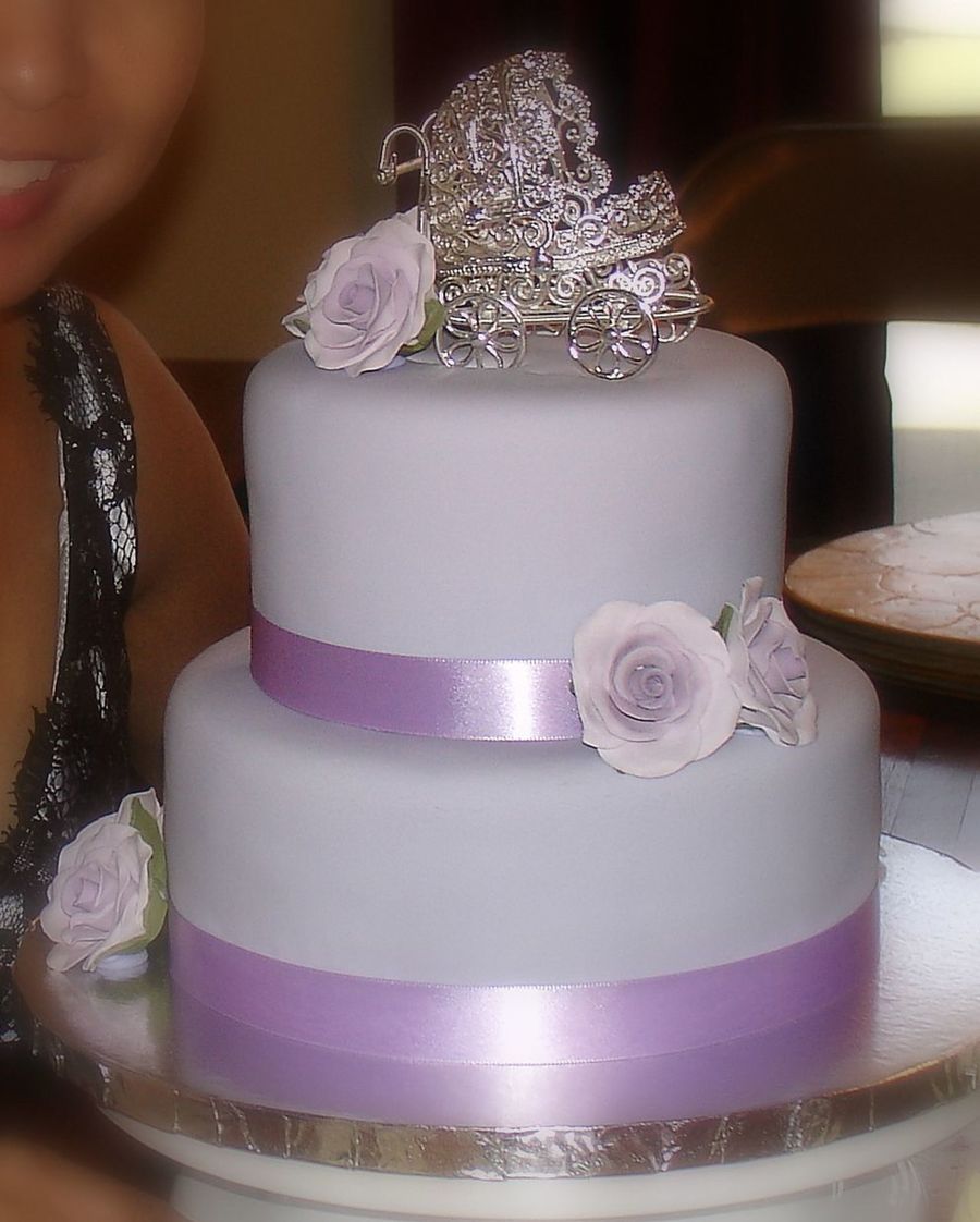 i made this cake for my daughter's baptism. still need more practice using fondant! baby carriage sinking...how could i have avoided this? WASC with BC filling, 8 and 6 inch rounds, violet fondant with gumpaste roses, Wilton baby silver baby carriage. i enjoyed making this cake and it tasted soooo good. thanks to the recipe found here on CC!!