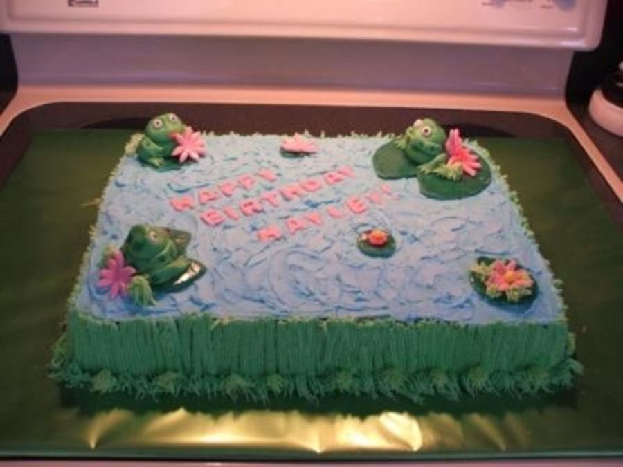 Frogs, lily pads, letters and flowers are fondant. Everything else is Buttercream. Thanks to Allison F. for help with the frogs.