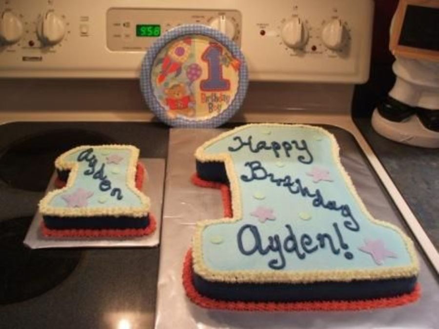 For a 1 year old's birthday. The large #1 was cut from 11 X 15 cake. The smash cake was cut from an 8" round. All buttercream.