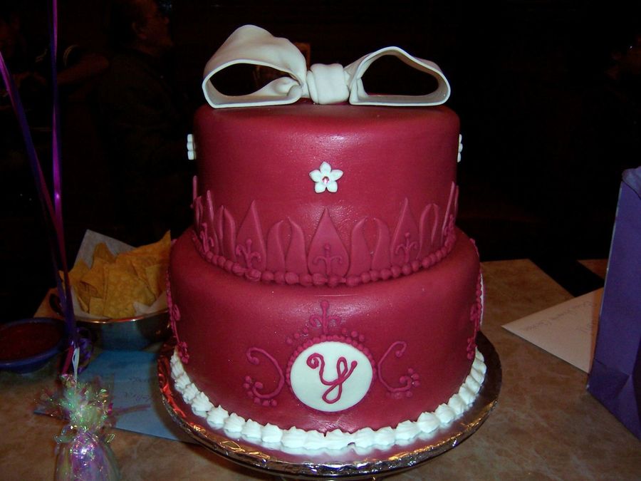 I made this cake for my mom's 60th birthday. It's covered with mmf with mmf & royal icing details. I also made the bow with a mmf/gumpaste mix. A little bit of shimmer was added with luster dust. You probably can't see it, but there's also a little swaroski crystal in each of the white flowers. The mmf detail on the top layer was supposed to look like flowers, but instead they look like flames. Oh well. Now I know what I can use to make flames if I need to.