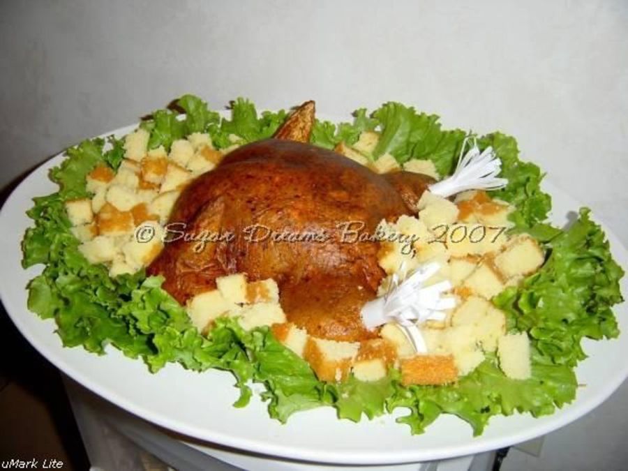 Here's my first Turkey Cake! I think it turned out pretty well considering it was my first attempt...so I'm pretty pleased with it. The 'White Meat' is white cake, and the 'Dark Meat' is Dark Chocolate Cake...I used the instructions found here on CC!