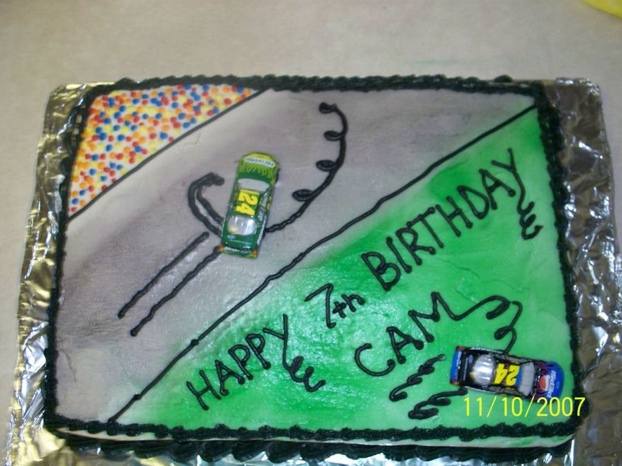 Another year, another race car cake for little man. He wanted the race track cake with his favorite driver doing a burnout. All buttercream, except for the cars, which were temporarily on loan from him. Thanks for looking!