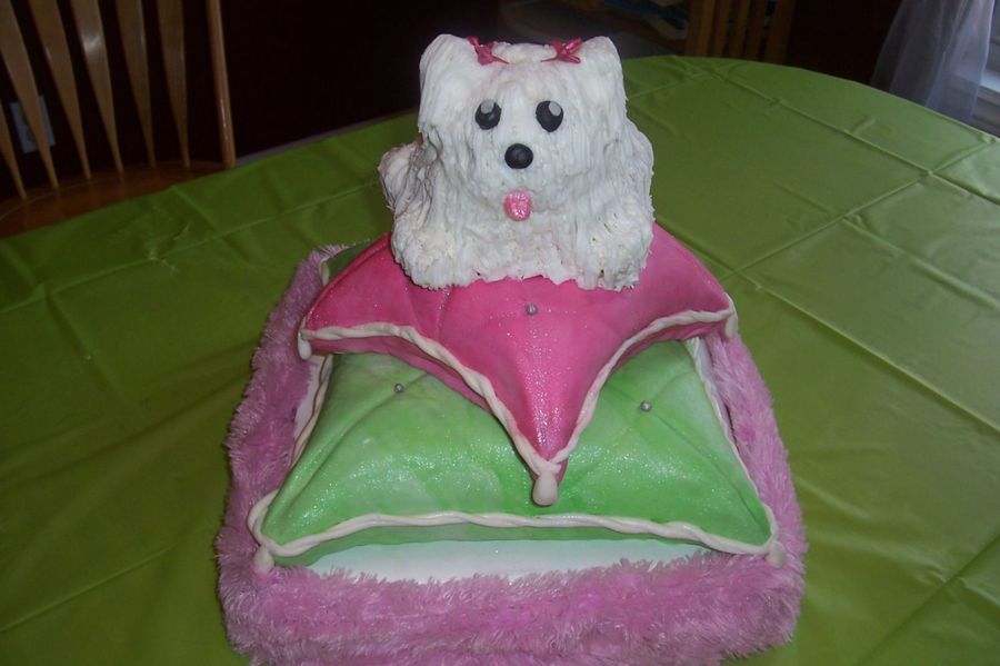 This cake was for my daughters 5th b-day, and she really wanted a dog , and i really wanted to make a pillow cake!!!!!! This was my first time doing a pillow cake, i had a hard time keeping the edges from falling down, maybe someone can give my some advice for the next pillow cake i make!!!! 12in and 8in with a loaf cake for the DOG!!!!!