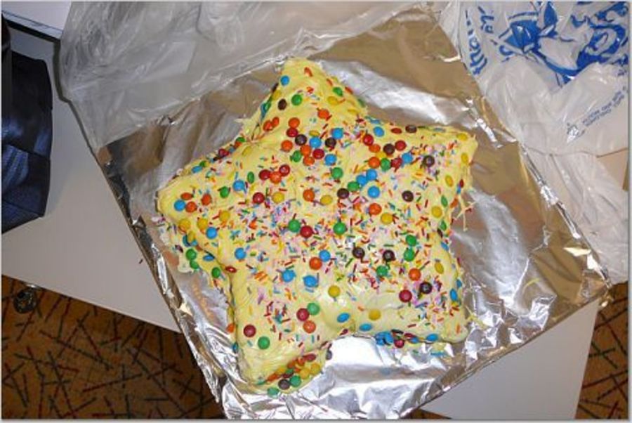 Last minute cake for an office 20th birthday party. Fun and crazy like the girl I made it for. Doesn't look like much but it tasted yummy (chocolate fudge cake with chocolate banana cocnut bavarian creme.)