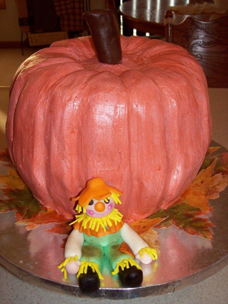 This is a recipe from this site called Heavenly Pumpkin Spice cake. It has a pumpkin filling. Covered in cream cheese BC, fondant scarecrow, wafer paper leaves. Thank you CC, for all the great ideas!