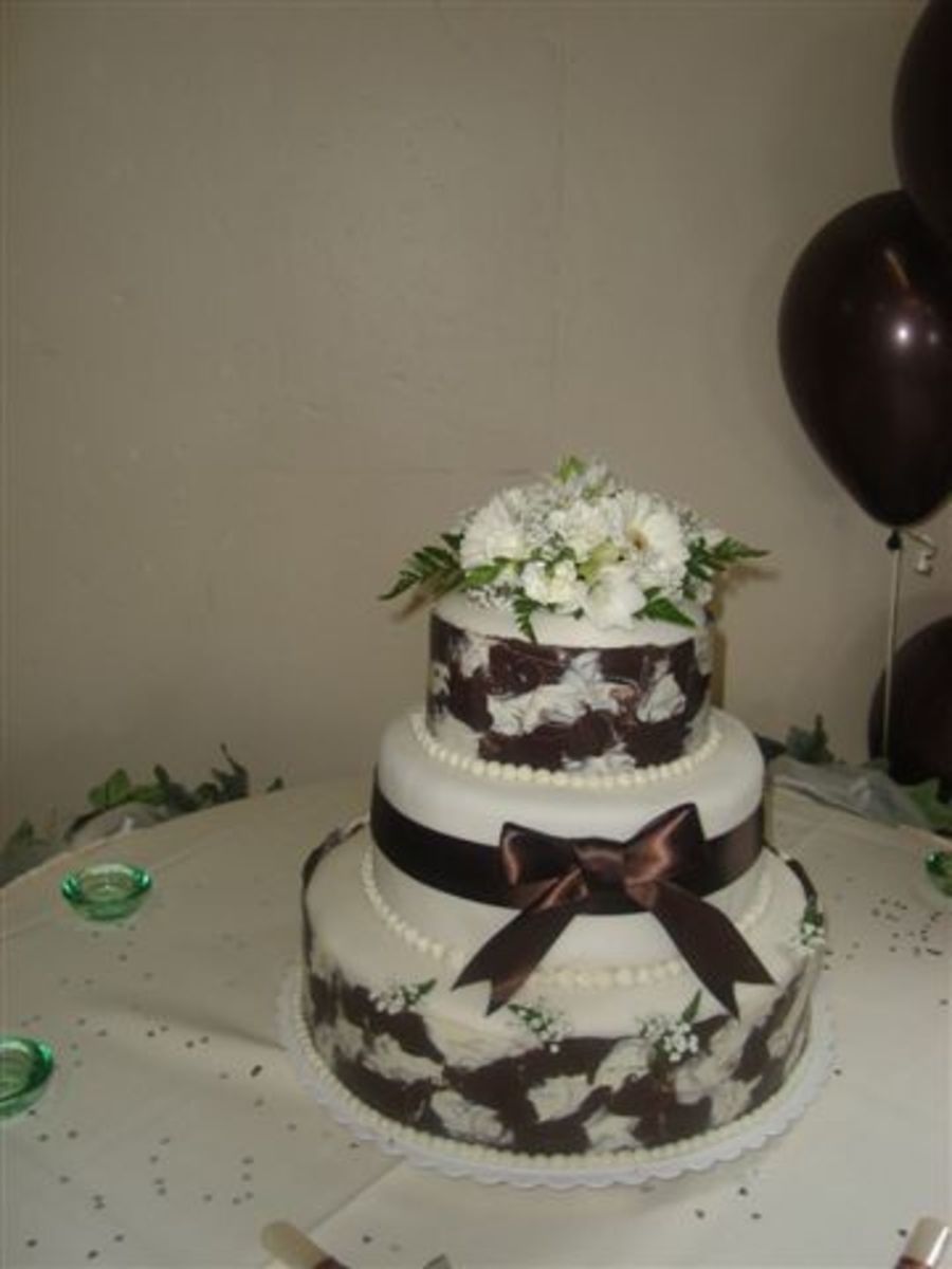 Top and Bottom layer is chocolate with raspberry filling and the middle layer is white cake with strawberry filling. Fondant on each layer with top and bottom layer done with marbelized chocolate. Buttercream icing under the fondant. Fresh flowers on the top.
