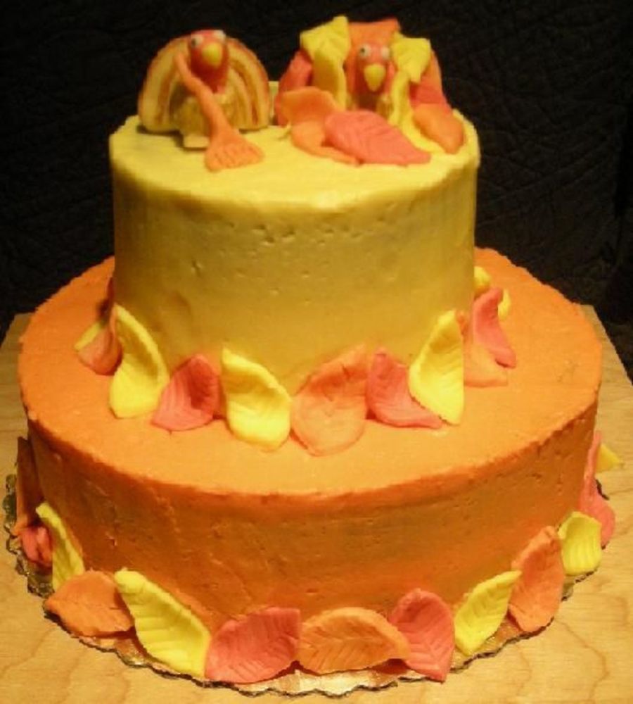 A chocolate cake covered in butter cream with modeling chocolate leaves and turkeys.