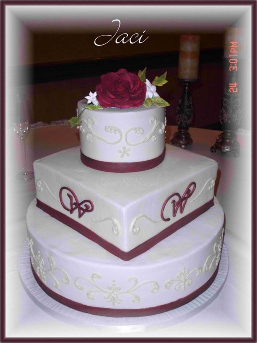 Single crimson rose with ivy and rose leaves top a 6" round and 10" square on a 16" round. Buttercream with ivory scrolls, fondant/gumpaste monograms in the font Vivaldi. Butterpecan and French Vanilla cakes. TFL