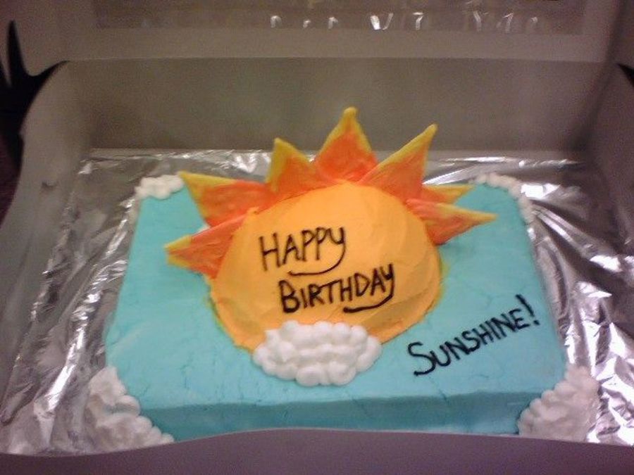 I made this cake for a co-worker. I alway call her sunshine because she says she hates sunny days. She absolutely loved the cake and was laughing when I surprised her with it. It is triple chocolate cake, and buttercream frosting. The sun's rays are made out of chocolate.