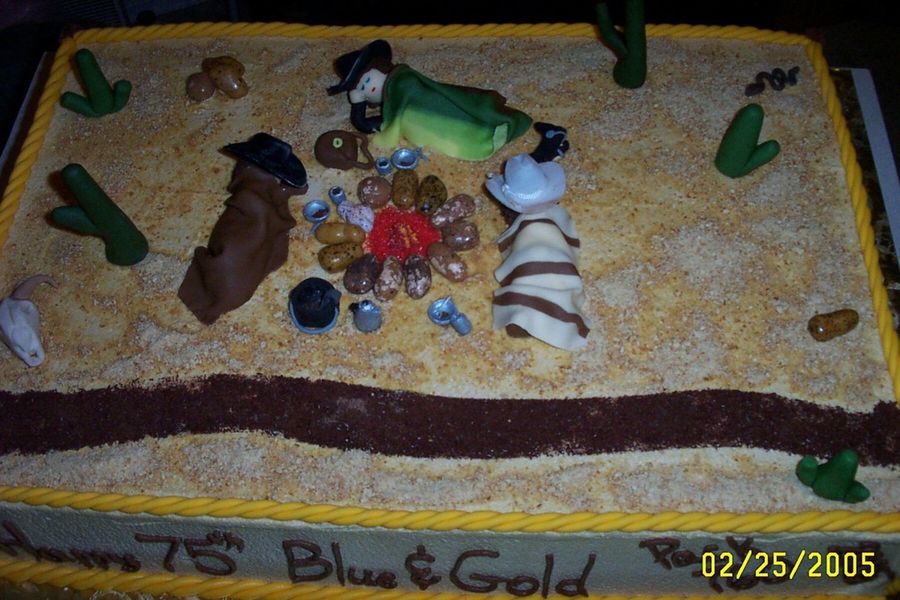 my son's cub scouts blue and gold banquet cake. I make the men and blankets and other decorations from fondant. The plates, cups, and coffee pot are fondant 'painted' with silver dust and vanilla. To make the rope I pushed fondant through a play dough press (reserved exclusively for fondant) and twisted the strands together.