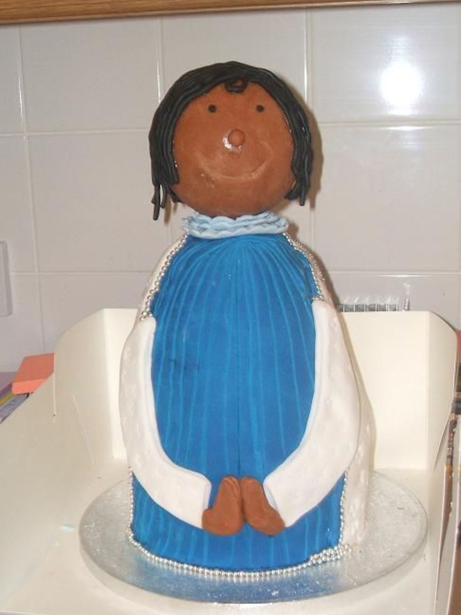 This was my practice cake for my childrens christening on the 23rd Dec, it is chocolate for the upper body and then maderia for the lower half. I had trouble with the fondant cracking though, it was good when it went on only after about half a hour later it started to crack. :(