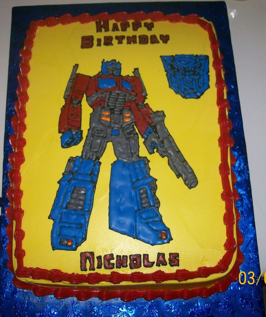 Birthday cake for one of my nephews who loves Transformers. This is a 11x15 white cake w/ strawberry filling. The Transformers and logo and letters were made out of royal icing and the rest w/ buttercream.