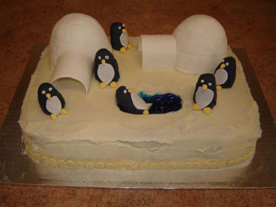 I borrowed this idea from several on this site, thanks for the inspiration! Cake is carrot with cream cheese icing. The igloos are chocolate cake covered in fondant. The igloo entrances are gumpaste and the penguins were sculpted from fondant. The "water" is tinted piping gel. Even though I was really sick when I put it together, this was a fun cake to make.