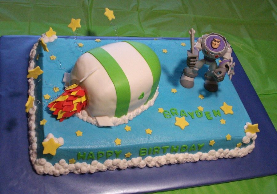 My great nephew wanted a Buzz cake so here is my effort, thanks to all CC cakes I got inspiration from. I feel like I cheated by using a Buzz figure, but after the attempt at the spaceship it just had to be... bottom is 1/2 sheet Chocolate Almond Sour Cream Wedding Cake recipe with buttecream icing, spaceship is the WASC covered in fondant (haven't done the fondant since the Wilton class as you can tell) details are fondant. Thanks for looking!