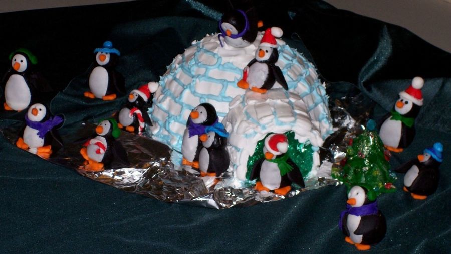 Here are some penguins and a make shift igloo.(Made it just to display the penguins) Someone ordered a penguin cake for Christmas, so I figured I would practice now...hope you enjoy!!