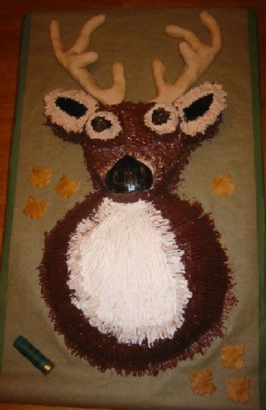 Marble cake with chocolate and buttercream icing. The antlers are fondant with vertical lines scribed into them to give a more real appearance (DH's idea). Fondant nose, eyes and inner ears painted black using food paste, fondant leaves painted brown. The only part which is not edible is the bullet shell. I have to improve on the eyes, one of this deer's eyes is a little high...