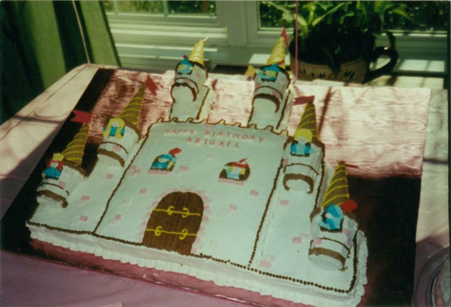 This was my first attempt at cake decorating. It was copied from 1989 Wilton book. All BC except for the knights and ladies profiles done in RI. Towers were icecream cones. I did this for my first granddaughters first birthday. It took me forever but was a big hit.