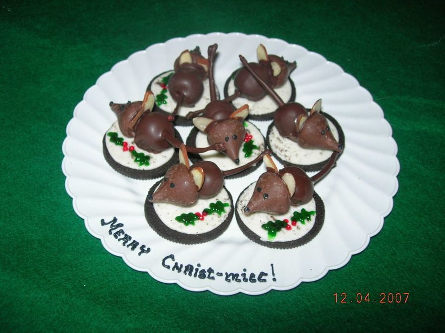 Based on photo by "Dale" my first try at these mice. Hershey kiss head, chocolate covered cherry tail, almond ears. Very fun!