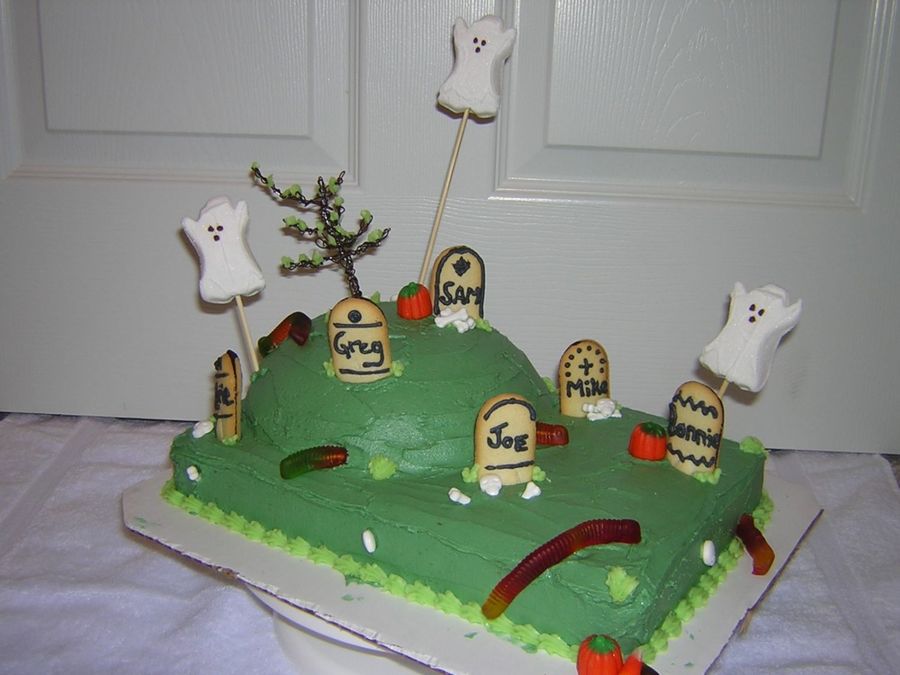 Graveyard scene, covered in butter cream. Candy for decoration. Tree is not edible.