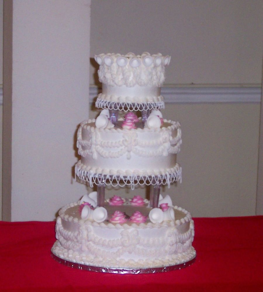 A replica of the original wedding cake, the picture was black and white, so we had to rely on the newspaper article as to the color of roses. All buttercream with royal icing drop strings. I haven't done drop strings for quite some time, so that was a challenge! Sorry I don't have a picture with the cake top, but it really looked great with it.