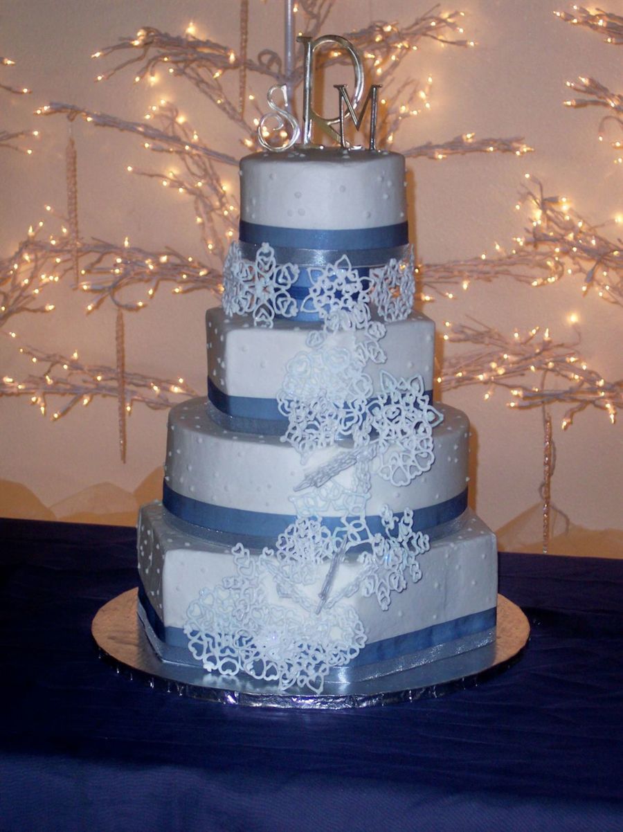 Buttercream, purchased ribbon and royal icing snowflakes with glitter.