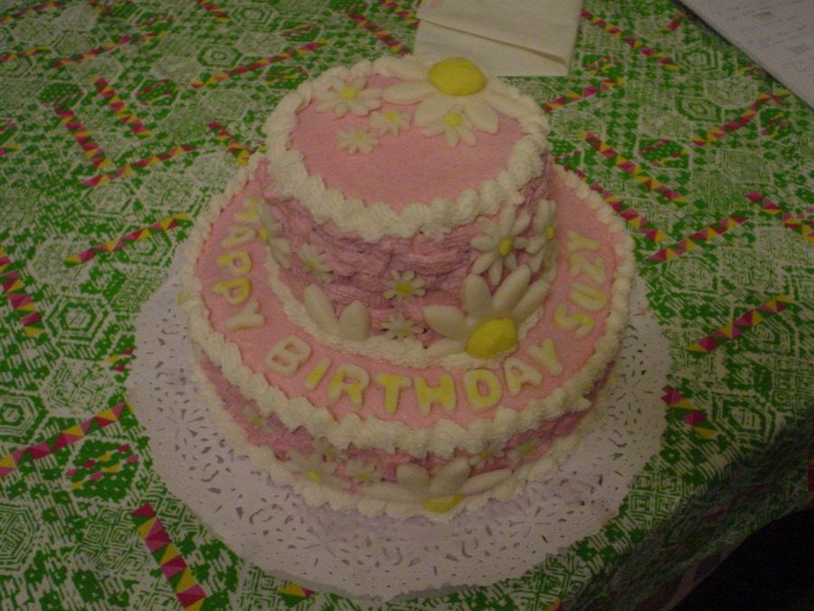 chocolate fudge cake filled with chocolate fudge filling.basketweave with pink BC. daisies with MMF.
