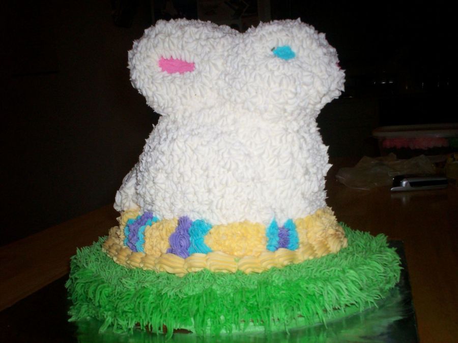 Pound cake made using Wilton's 3D bunny mold. Iced in buttercream. The "egg" base and grass are half vanilla/half chocolate, also iced in buttercream.