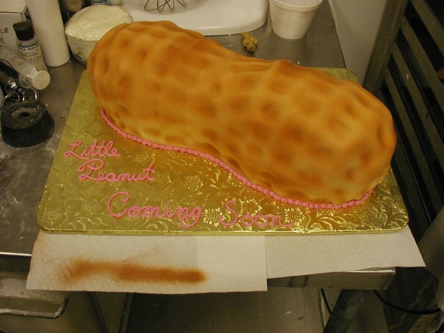 This is a 1/2 sheet cake stacked and carved to look like a peanut! Covered in fondant and airbrushed. The coustomer was having a peanut themed baby shower, b/c they call the baby "peanut" I thought that was so cute! Thanks for looking ~Donna ps sorry about the bad picture, the ones that I took with my background changed the color so much it looked like some strange squash! I need to ask Santa for some profesional lights...