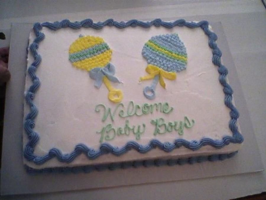 Made this cake for baby shower for someone at my mom's work. The rattles were free-hand and I like the yellow one much better than the blue one!!