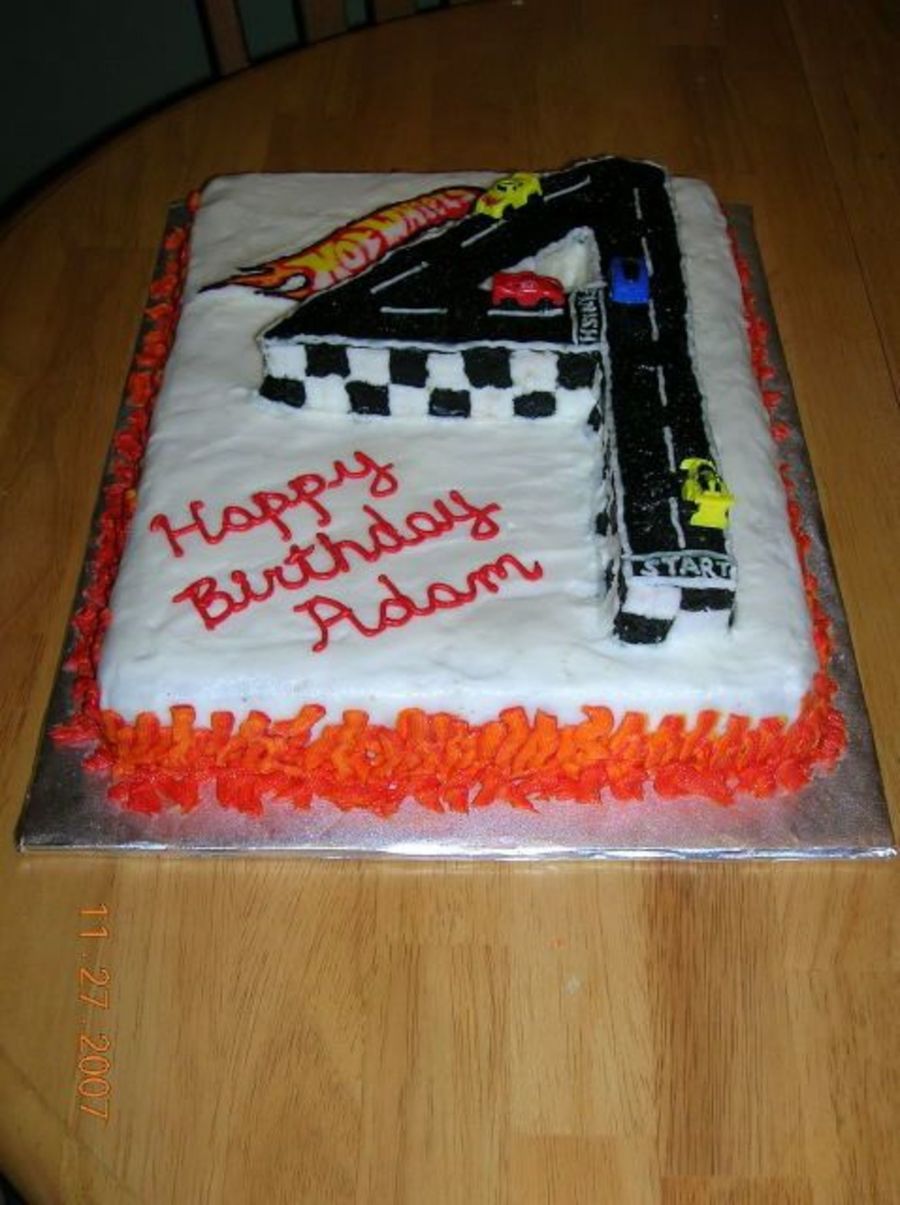 Darn good CC sheet cake covered in BC with striping technique for flames. Number 4 was carved from yellow cake covered in BC as well. HotWheels logo was FBCT. Cars were micro-sized. Got ideas for this cake from lots of different cakes here on CC. Thanks for the the inspiration!